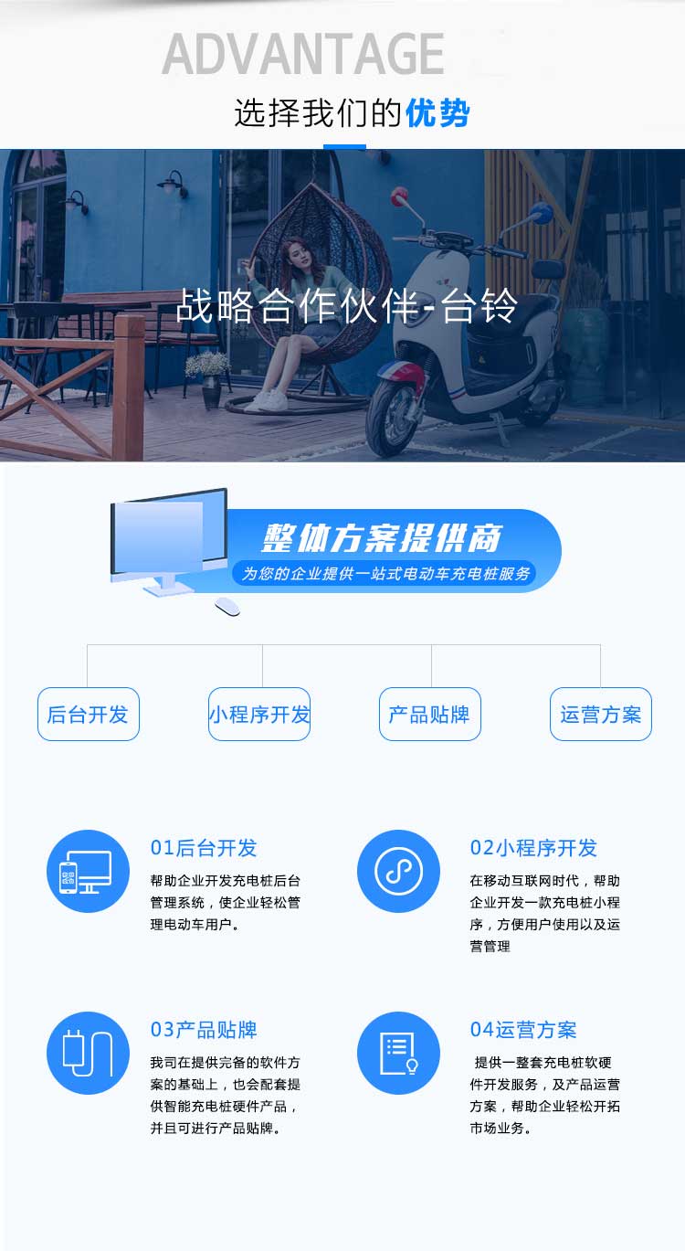 動車、智能充電樁、智能充電柜、電動車銷售與售后平臺,致力于打造一套完整的電動車生態圈,為客戶提供電動車從購買到使用、充換電及售后乖全方位的產品體驗。